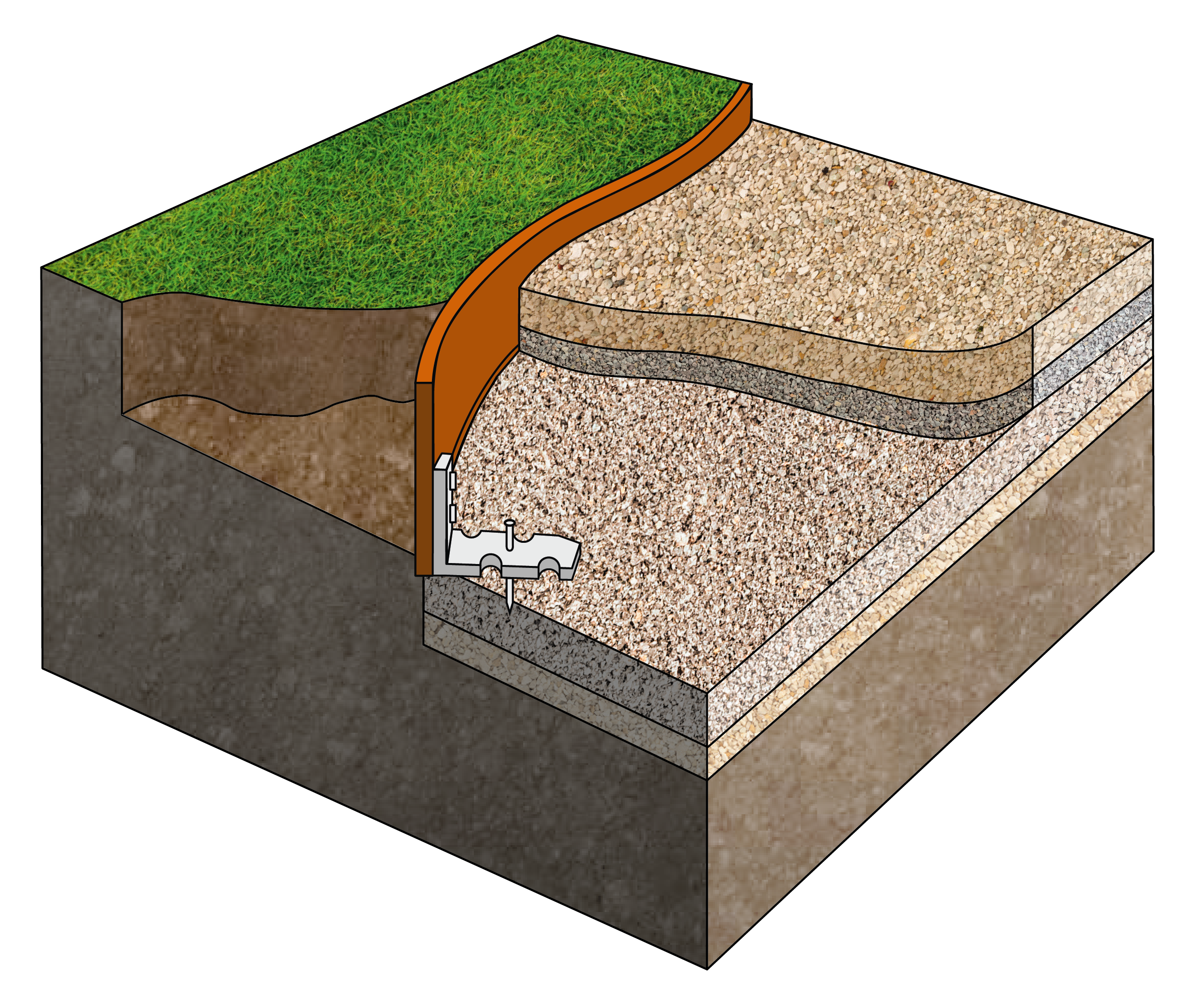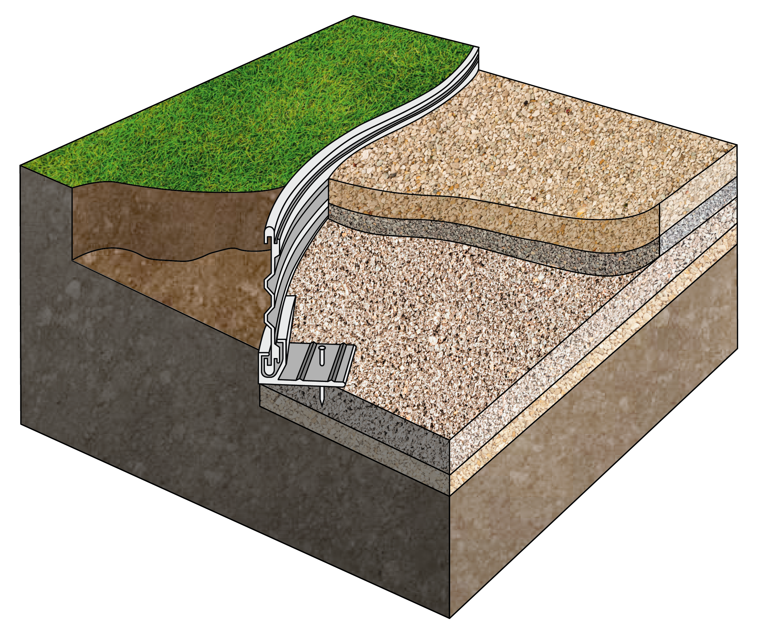Special concrete/ground anchors provide particularly strong support for heavily used profiles. The edge can be laid easily and in almost any shape, makes efficient use of materials and does not require specific tools. Despite its low weight, it is extremely robust and does not decay, crack or rust unlike wood, plastic or steel.
