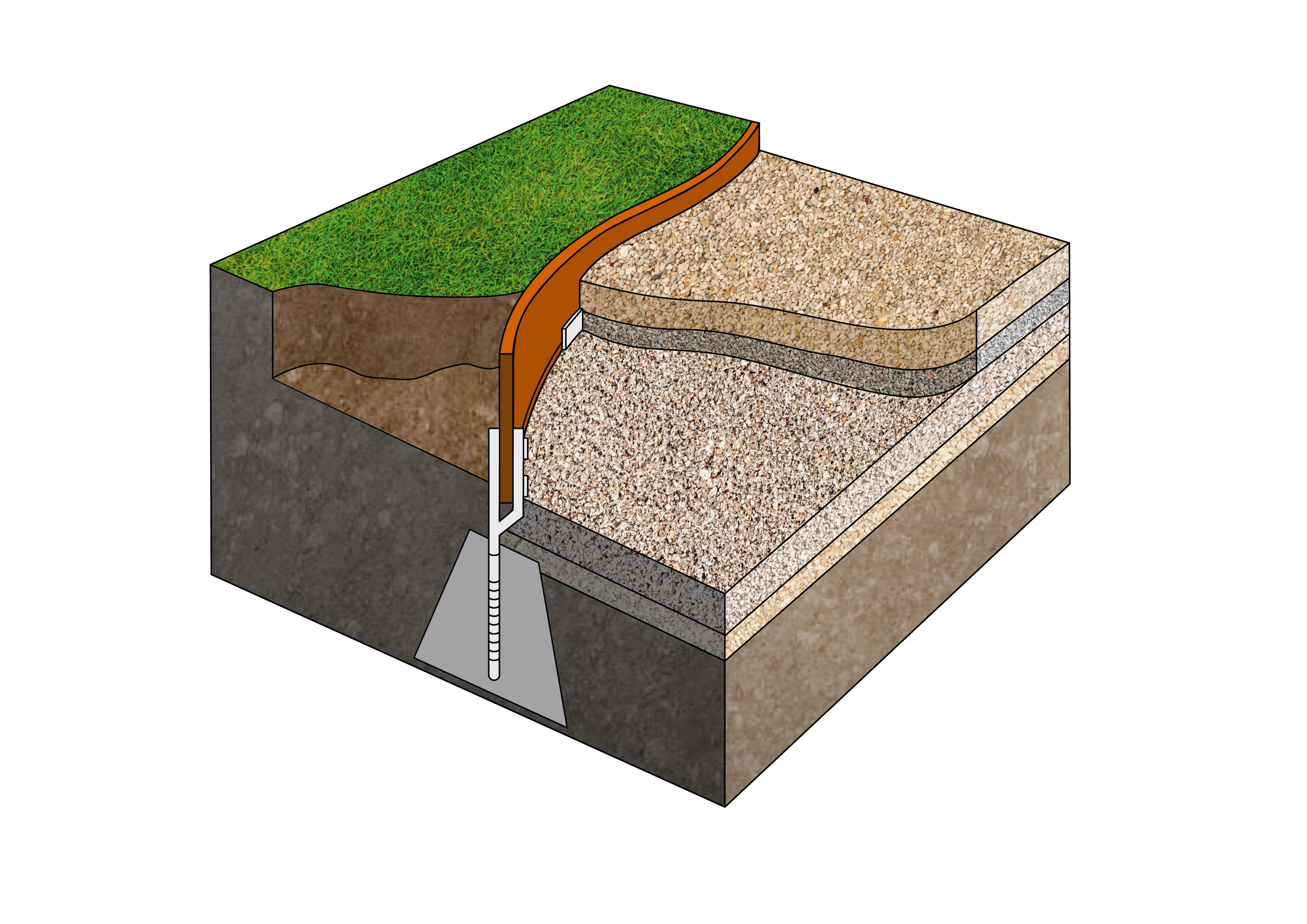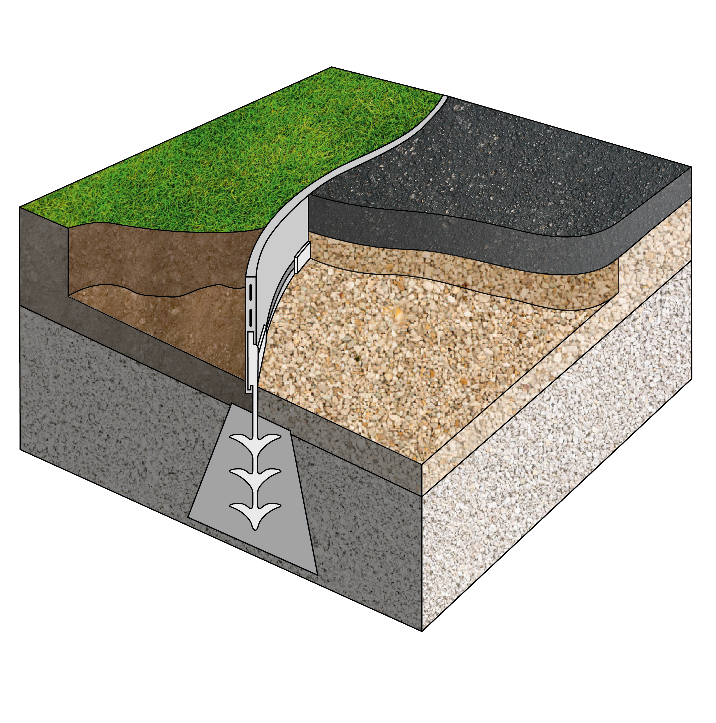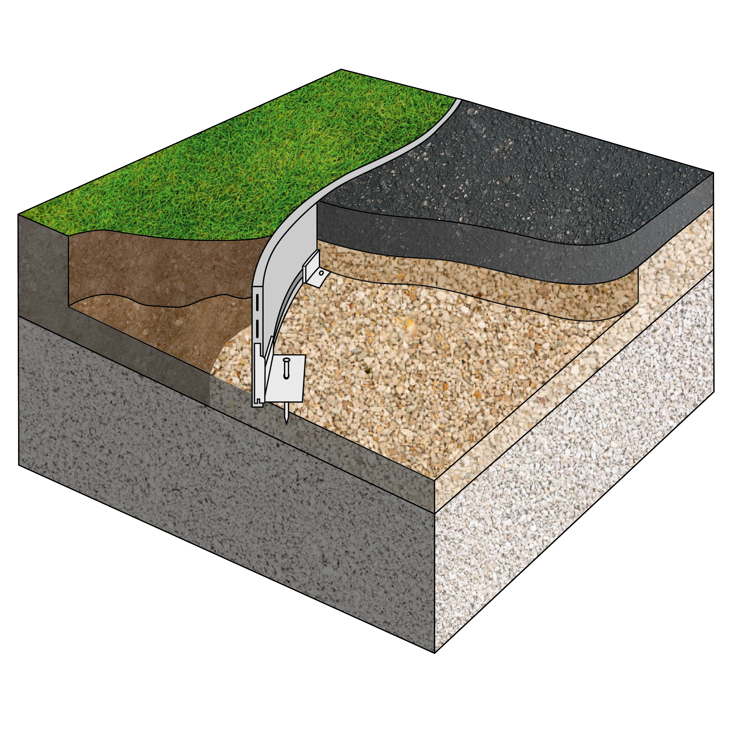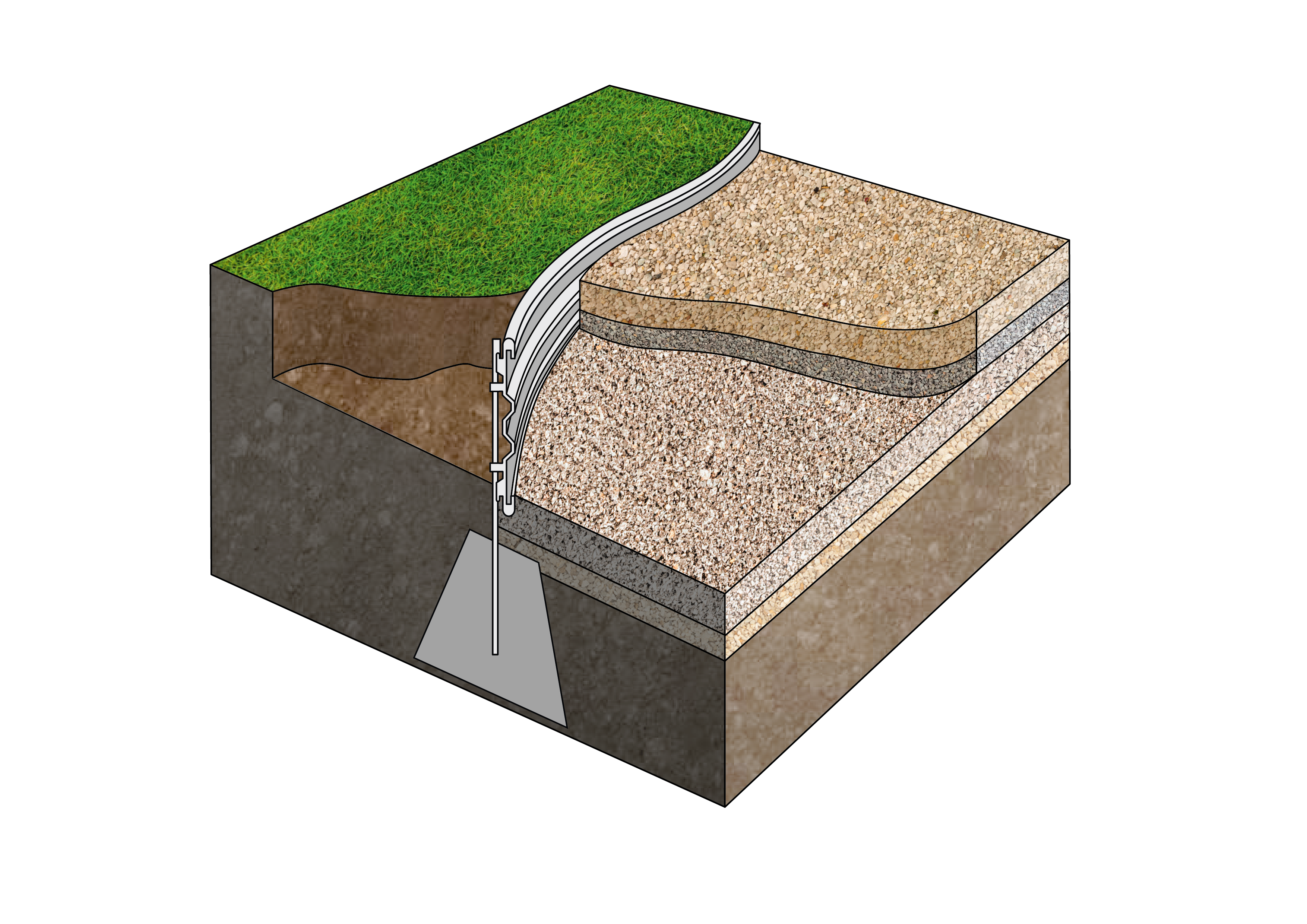 Special concrete/ground anchors provide particularly strong support for heavily used profiles. The edge can be laid easily and in almost any shape, makes efficient use of materials and does not require specific tools. Despite its low weight, it is extremely robust and does not decay, crack or rust unlike wood, plastic or steel.